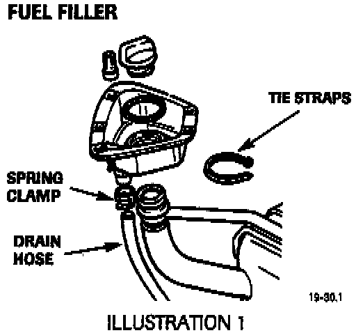 10. Remove the tie straps securing the filler drain hose to the filler neck. Remove the filler drain hose spring clamp (Illustration 1) and remove the drain hose from the body grommet