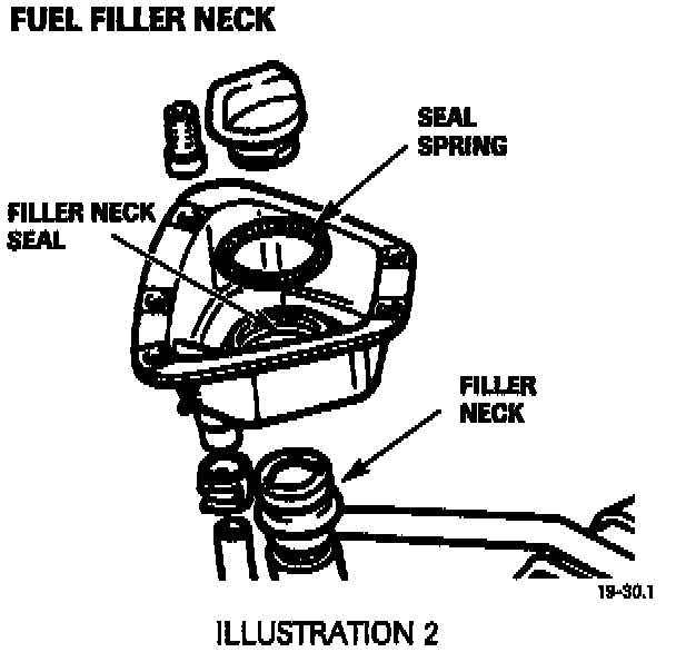 13. Remove the filler neck spring from around the filler neck seal and pull the seal up, free of the filler neck (Illustration 2).