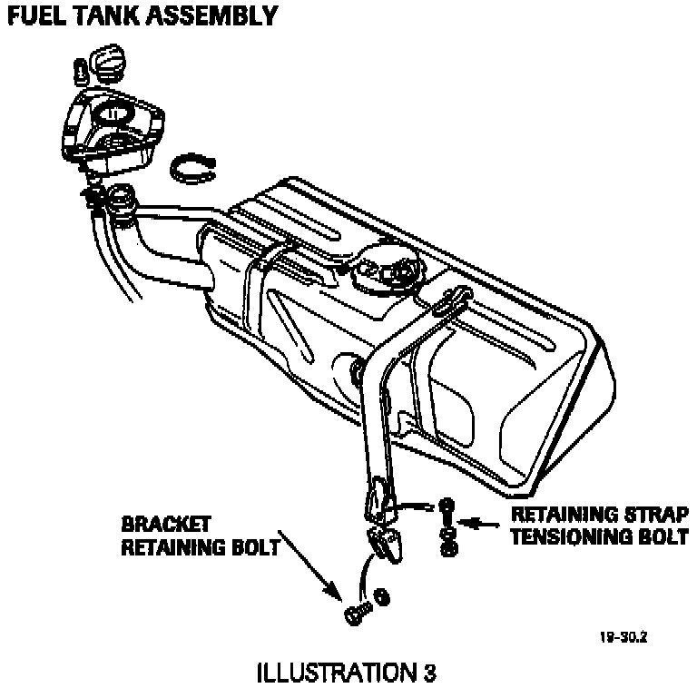 14. Loosen the fuel tank retaining strap tensioning bolts at the lower brackets (Illustration 3). Remove the bracket retaining bolts. Leave the brackets attached to the retaining straps.