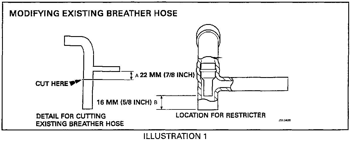15. Cut the existing breather hose as shown in Illustration 1. Make sure that a clean cut is made, maintaining the 22 mm (7/8 inch) dimension consistently.