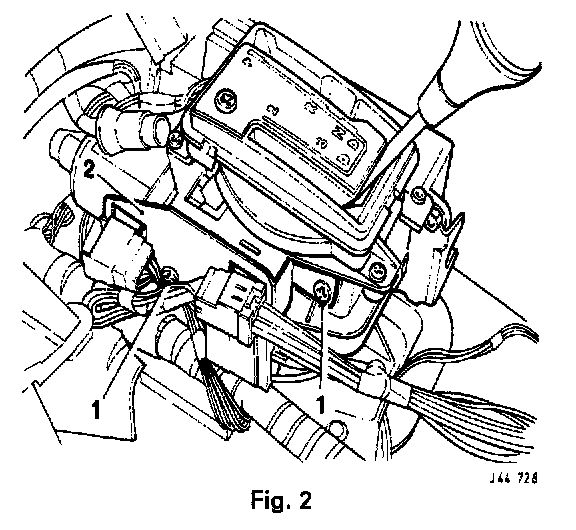 - Disconnect the gearshift interlock solenoid multi way connectors, remove the two screws (1 Fig. 2) and remove the interlock mechanism side cover (2 Fig. 2).