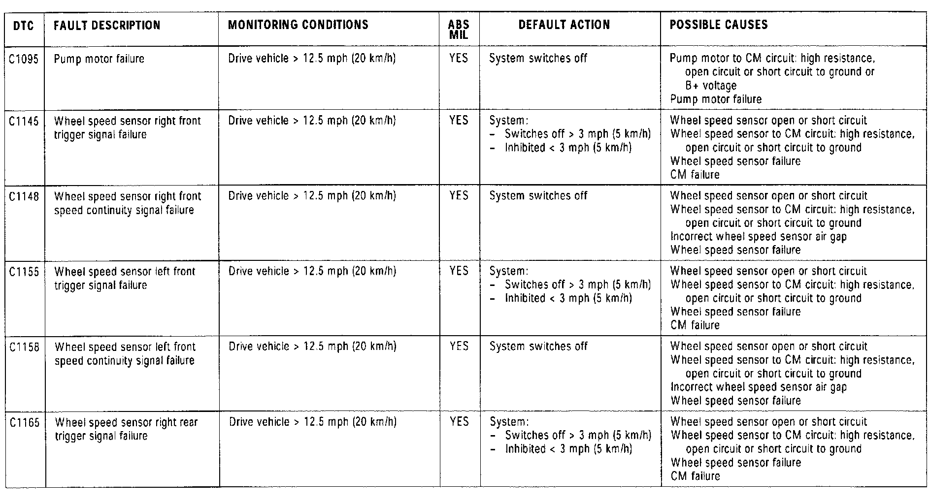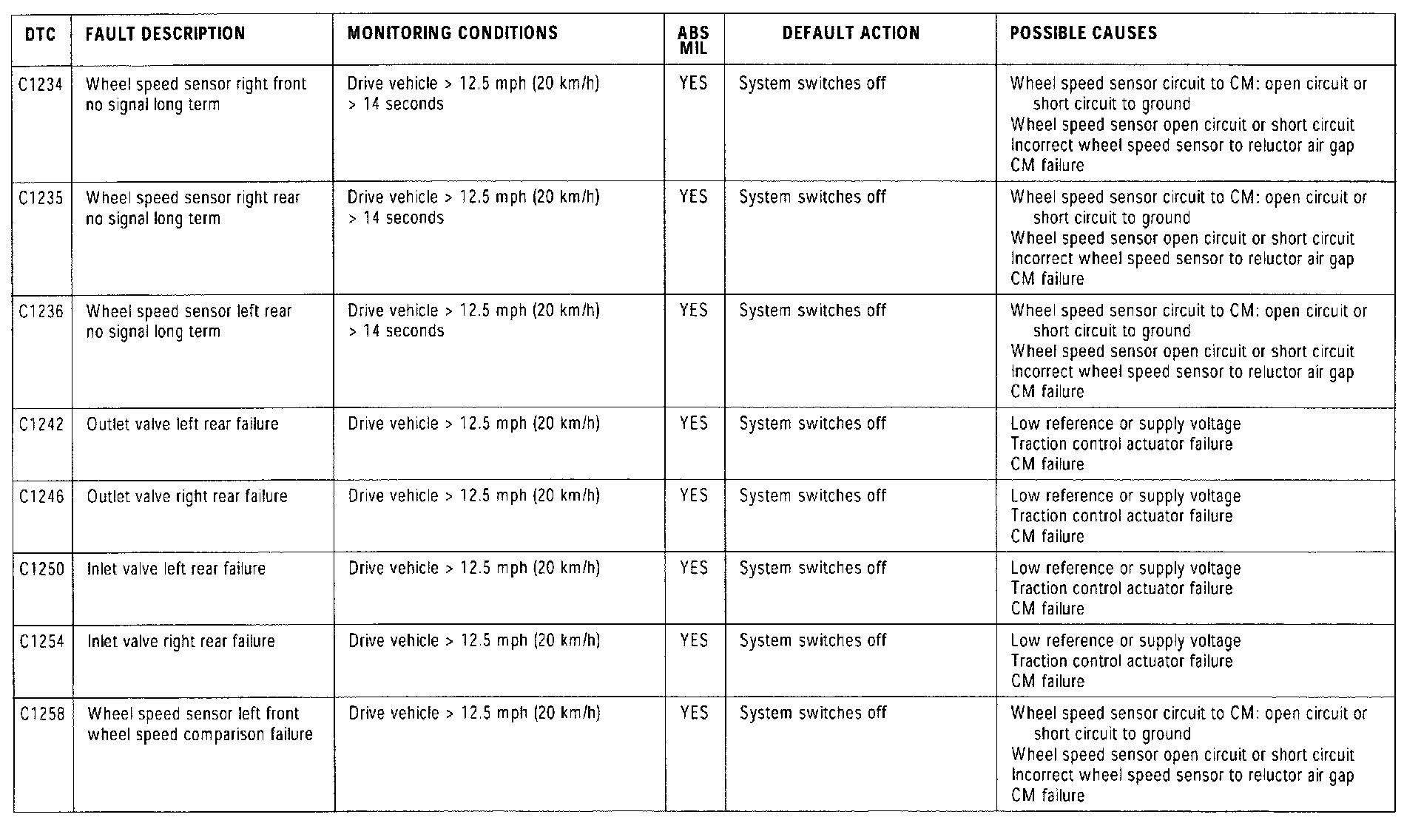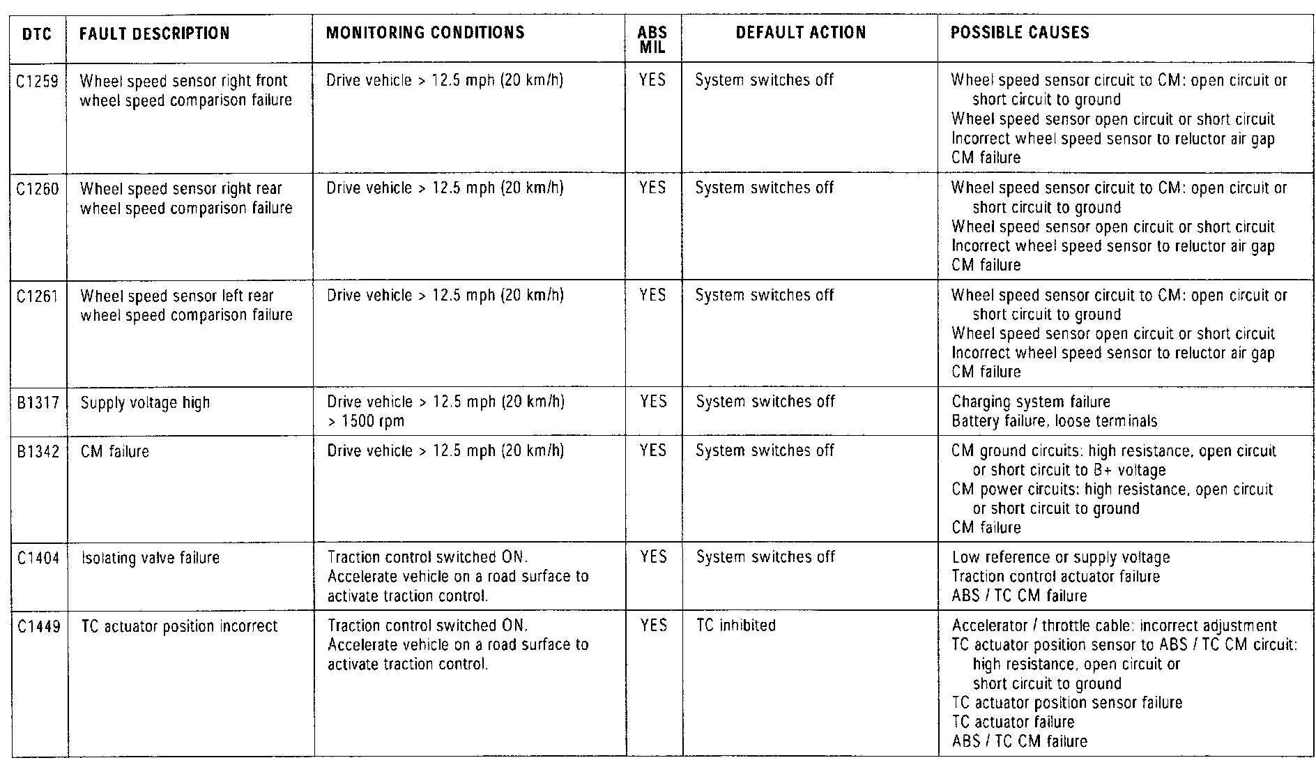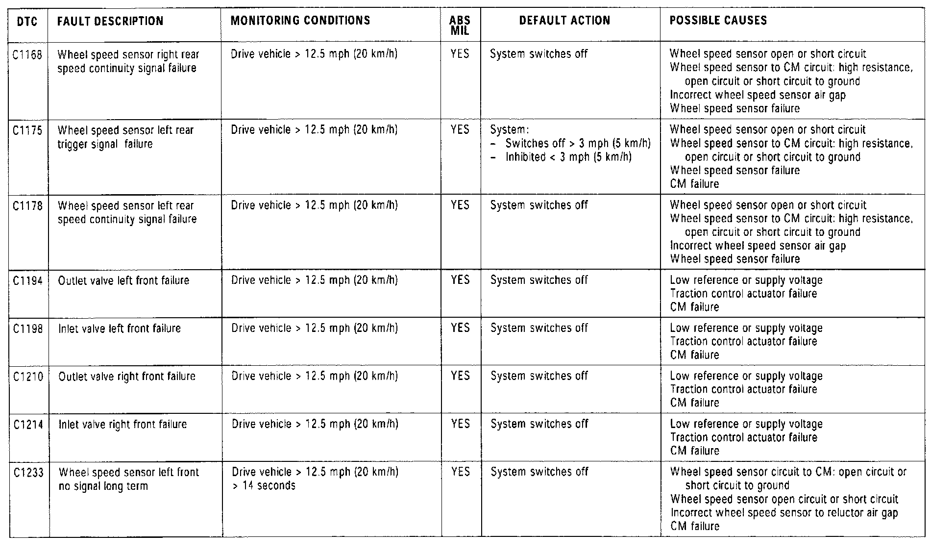 Depending on the fault detected, the ABS or ABS/TC module will adopt one of the following default actions: