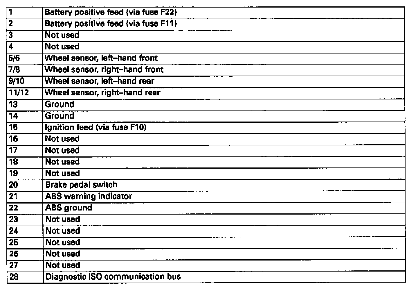 Control module connections, numbered 1 to 28, provide the necessary input/output signals to enable the module to control and monitor ABS operation.