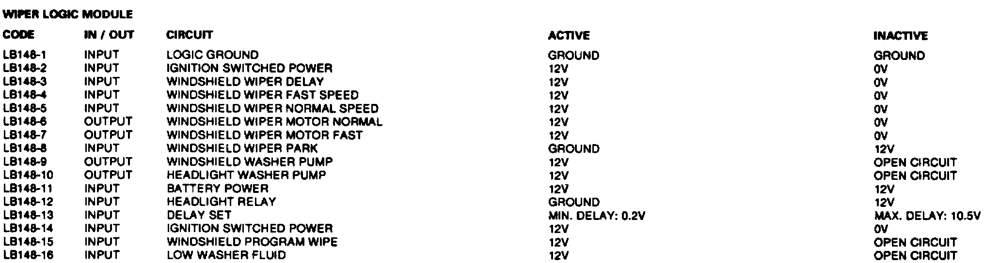 Windshield Wipers, Windshield Washers: Inputs/Outputs: