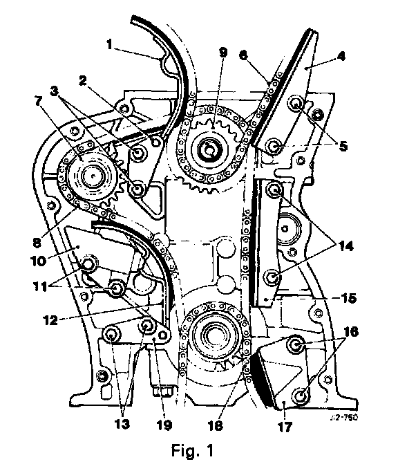 - Remove the bolts (11 Fig. 1) securing the chain tensioner and remove the assembly (17 Fig. 1).