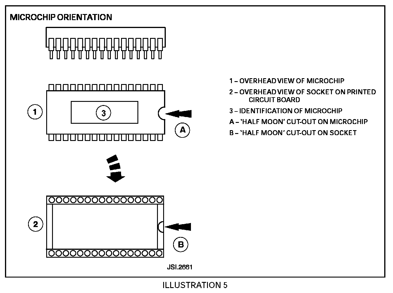 9. When inserting the replacement PROM microchips, identify the 'half moon' cutouts in both the microchip and the socket on the printed circuit board (Illustration 5).