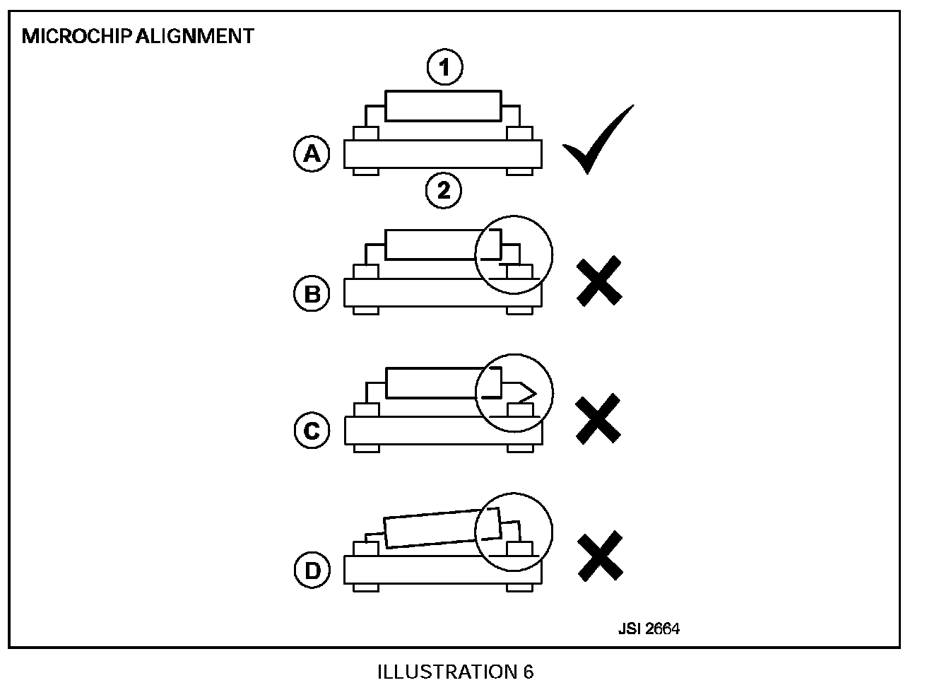 12. Use great care to achieve condition '1' in Illustration 6. The microchip must lie parallel to the printed circuit board, with all pins fully engaged into their corresponding locations in the socket.