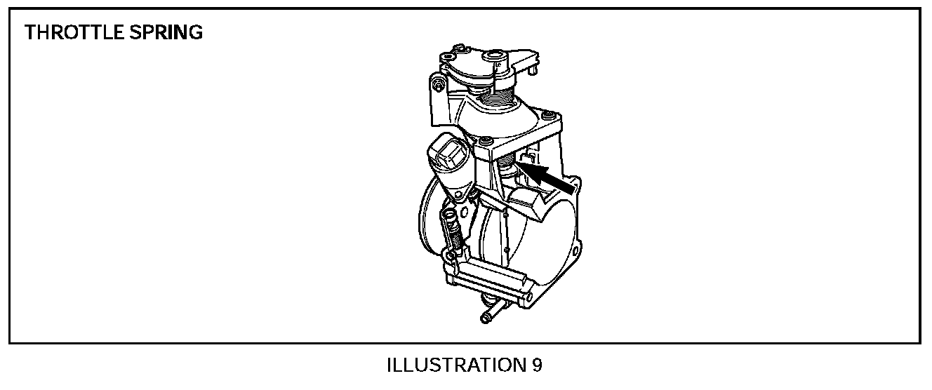 4. Unhook the throttle torsion spring (Illustration 9) from the throttle shaft actuator and then remove the spring and the sleeve from the shaft.