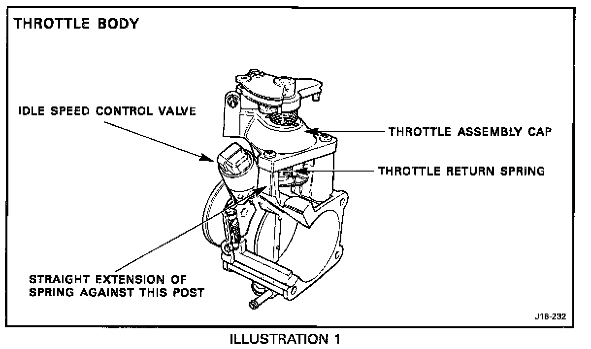 The revised throttle return spring must be pre-loaded by rotating the straight extension one full turn counterclockwise until it can be installed in the same position against the post next to the idle speed control valve, as the original spring.