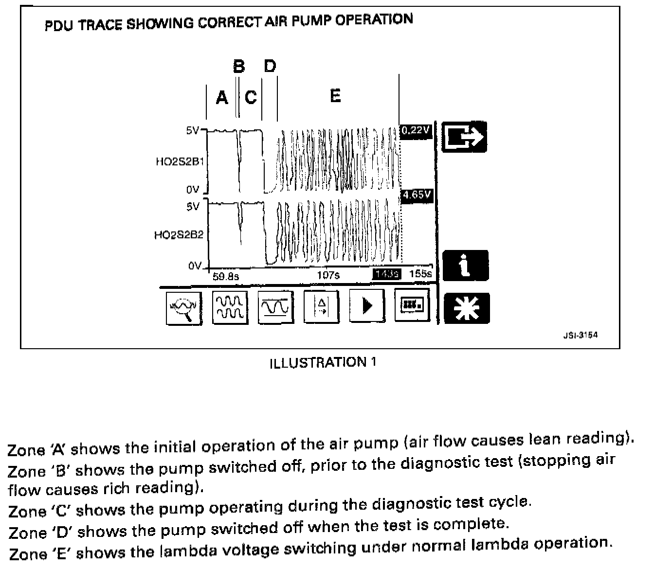 The AIR pump operates for a short period of time following every engine start. It typically operates for approximately 10-20 seconds at normal operating temperatures, then switches off for approximately 5-10 seconds, and then restarts to allow the system diagnostic check to occur. This check also takes approximately 5-10 seconds. See Illustration 1, sample of PDU trace. This complete cycle takes place each time the engine is started. * This is the re-test referred to in the flow chart. *