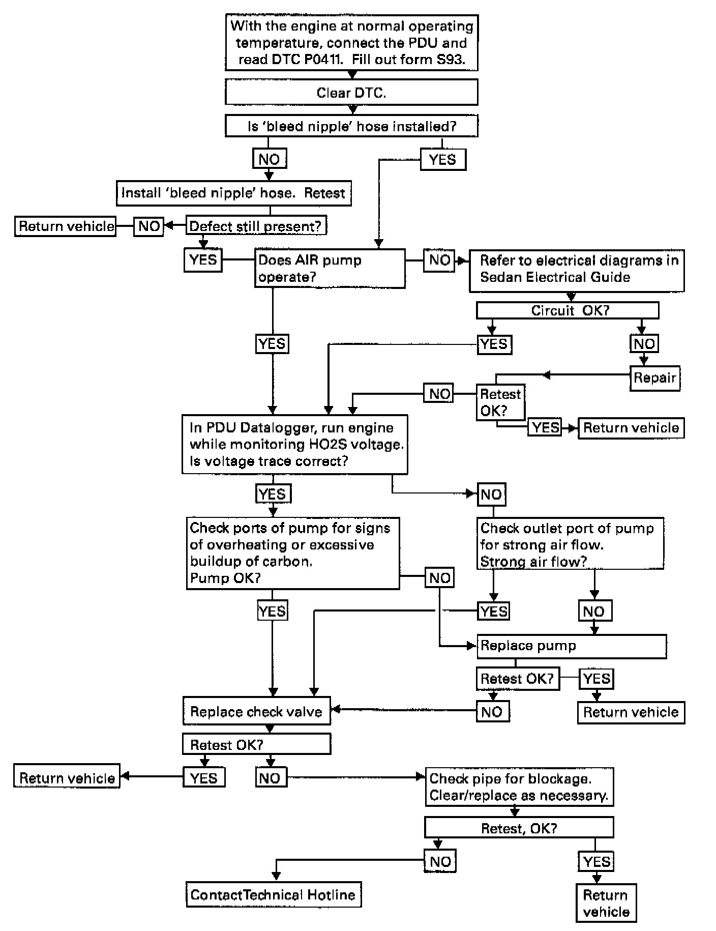 In case of a customer complaint on a Sedan Range vehicle within the above VIN range of MIL illumination, with DTC P0411 flagged, follow the diagnostic flowchart in this bulletin. The following text provides additional information.