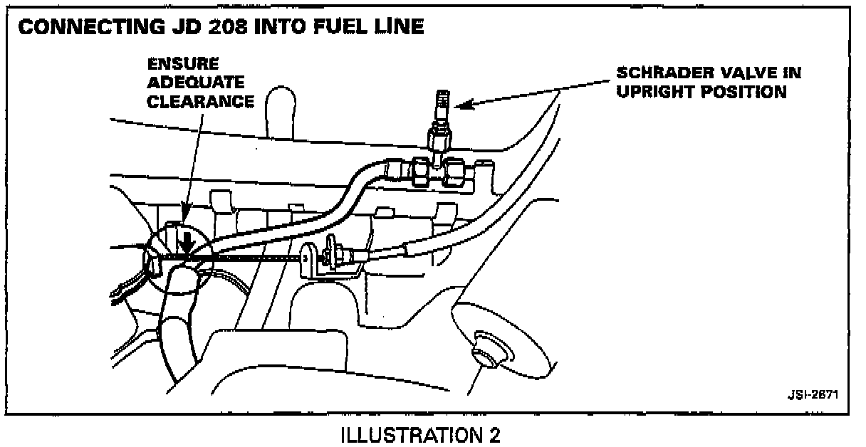 5. Align special tool JD 208 with the fuel rail with the Schrader valve positioned upright. Start and fully tighten the union nut. (Illustration 2).
