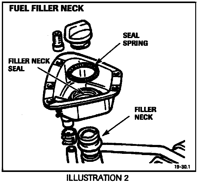 13. Remove the filler neck spring from around the filler neck seal and pull the seal up, free of the filler neck (Illustration 2).