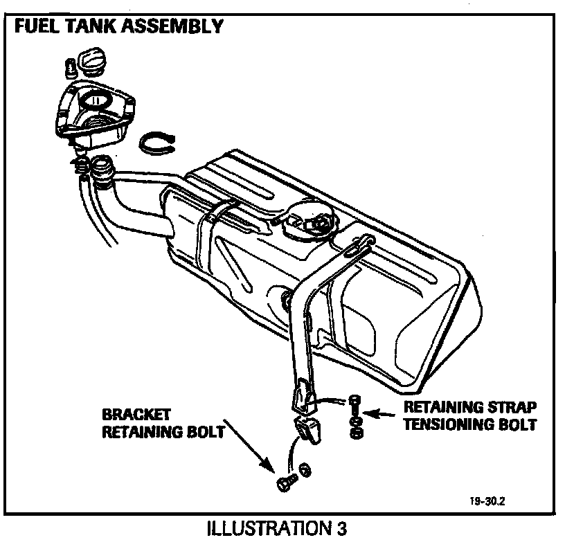 14. Loosen the fuel tank retaining strap tensioning bolts at the lower brackets (Illustration 3). Remove the bracket retaining bolts. Leave the brackets attached to the retaining straps.