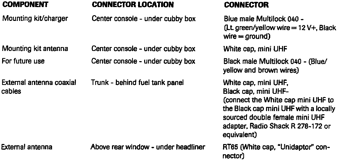 The security system antenna is in the rear window. Mount the cellular telephone "glass mount" external antenna to the left of the security system antenna. Most external antenna installations will require an FME / Mini UHF adapter (Hirschmann 927950-008) to connect to the external antenna cable. The adapter may be sourced locally. It is also available from Hirschmann of America Inc., Riverdale, NJ (tel. 201-835-5002).