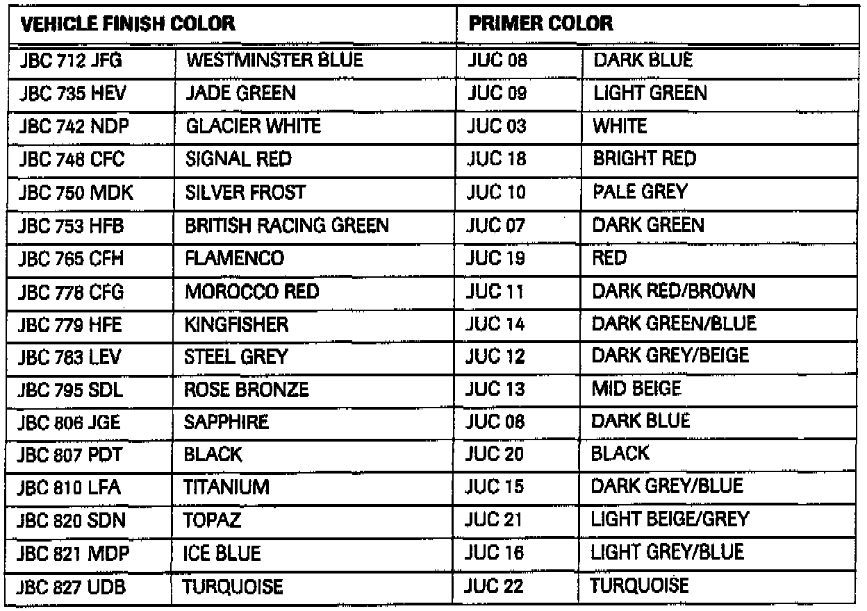 To repair a vehicle to original specification, the primer material must match the finish coat color. Use the table to match primer color to vehicle finish color.