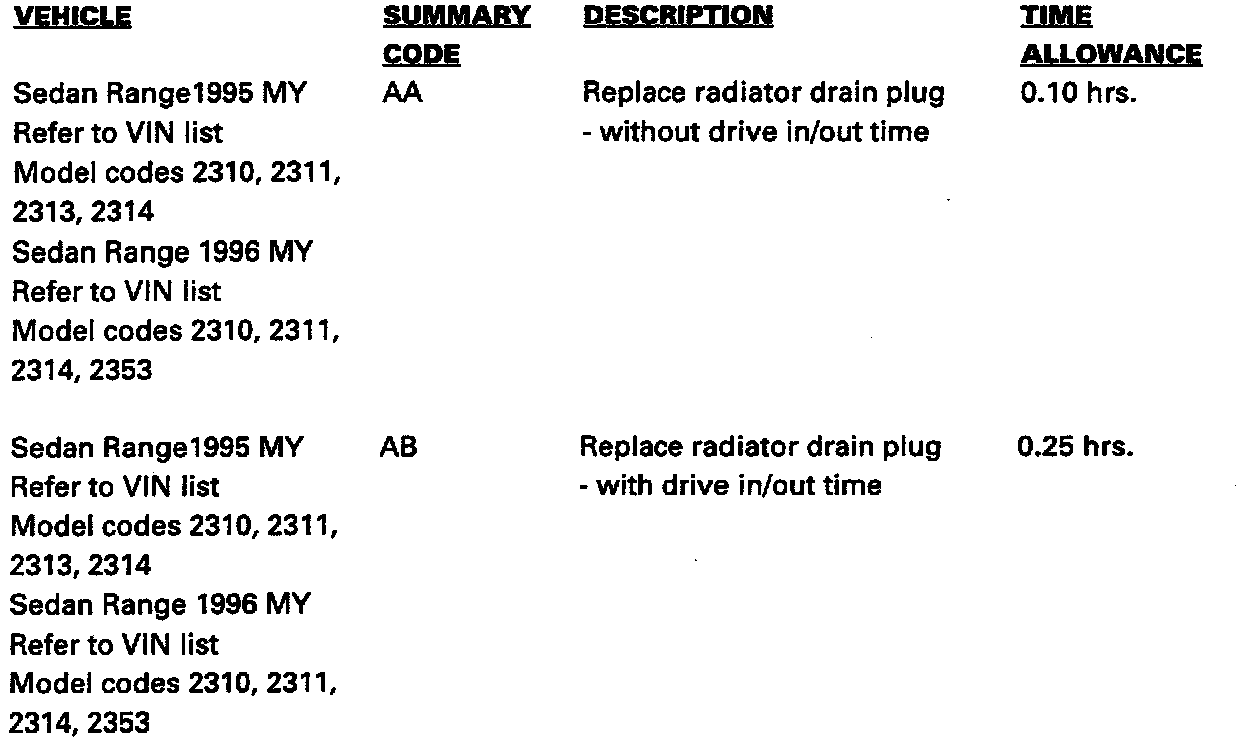 Some 1995 MY Sedan Range vehicles specified on the included VIN list may have radiators assembled with drain plugs manufactured from a material which does not meet current specifications.