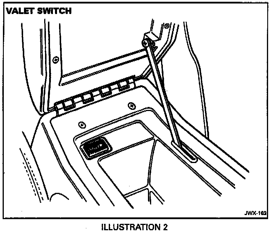 3. Rock the valet switch located in the center console storage compartment (Illustration 2) 5 times. A single confirmation chirp and flash of the headlamps indicate that the security system has entered the learning mode.