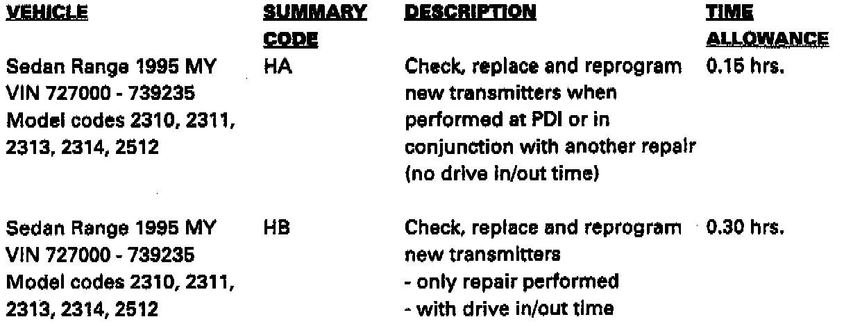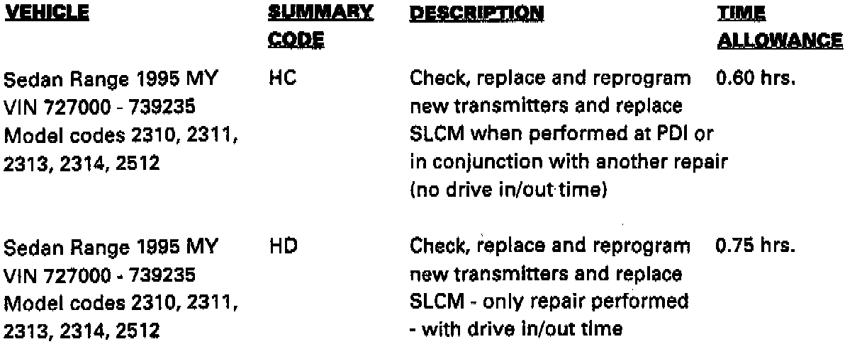 The Panic Alarm may not operate on some 1995 MY Sedan Range vehicle in the above VIN range. The absence of the Panic Alarm may result from either a transmitter problem or an Security Locking Control Module, (SLCM) problem or a combination of both.