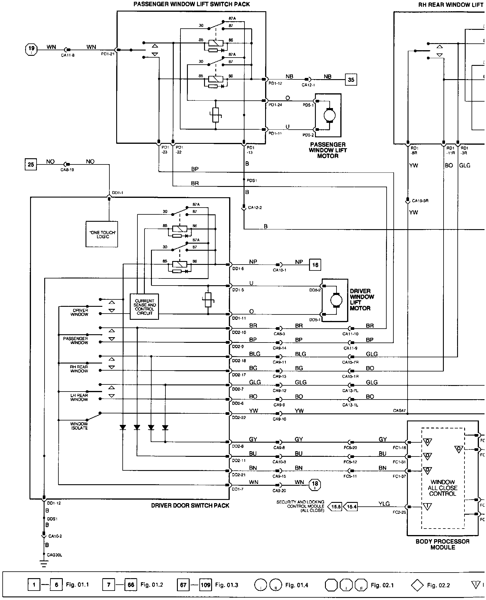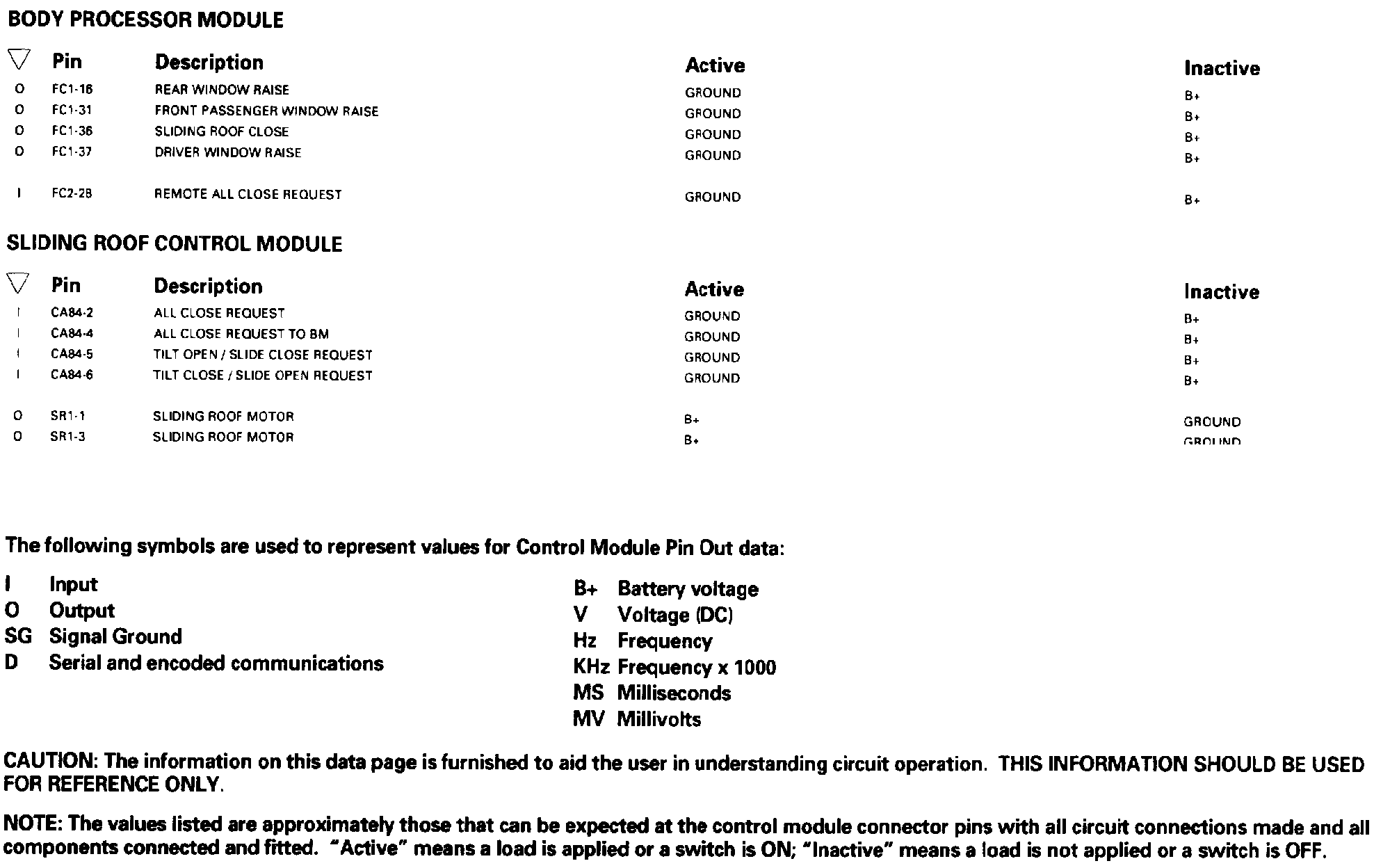 Window Lifts; Sliding Roof-LHD: Control Module Pin Out Information: