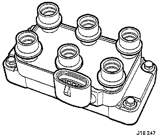 The ignition coil pack contains three separate ignition coils which are controlled by the igniter through three coil leads. Each ignition coil ignites two spark plugs simultaneously, one spark in the compression stroke and one on the exhaust stroke.
