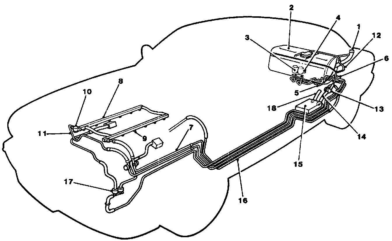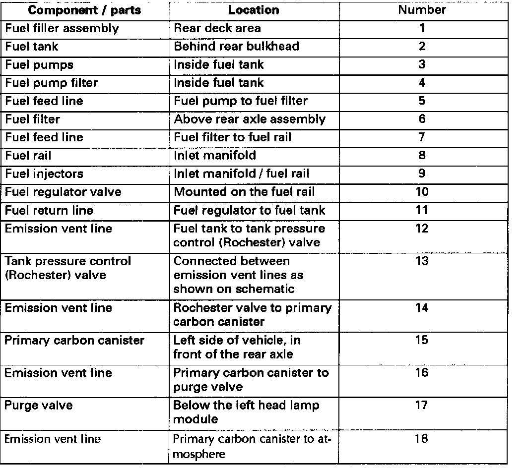 The above schematic illustration (Fig. 1), shows the part and component layout of the fuel system and is to be read with the table below.