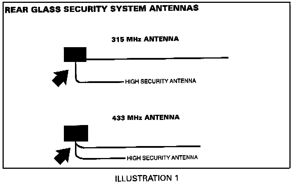 The frequency is incorporated in the last 3 digits of the FCC ID number. This number is located on the back of the key fob transmitter battery cover and on the sticker on the SLCM. The antenna is located near the top center of the rear glass and can be identified by its configuration (Illustration 1).