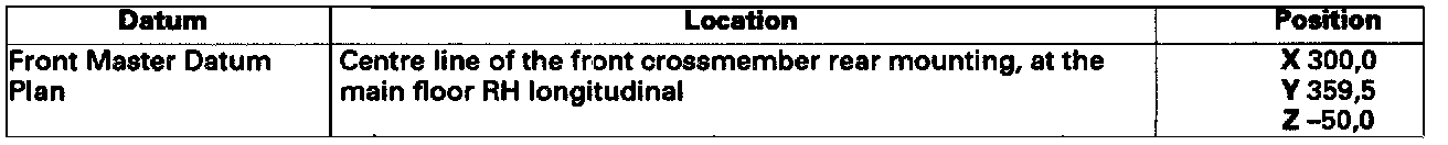 The FRONT MASTER DATUM (front crossmember rear mounting at the inner face of the main floor RH longitudinal) is nominally 359,5 mm to the right-hand side of the body center line. The LH side front datum is measured 717,0 / 721,O mm from the RH. Please refer to the Image in Body Dimensions - Plan View. Body Dimensions