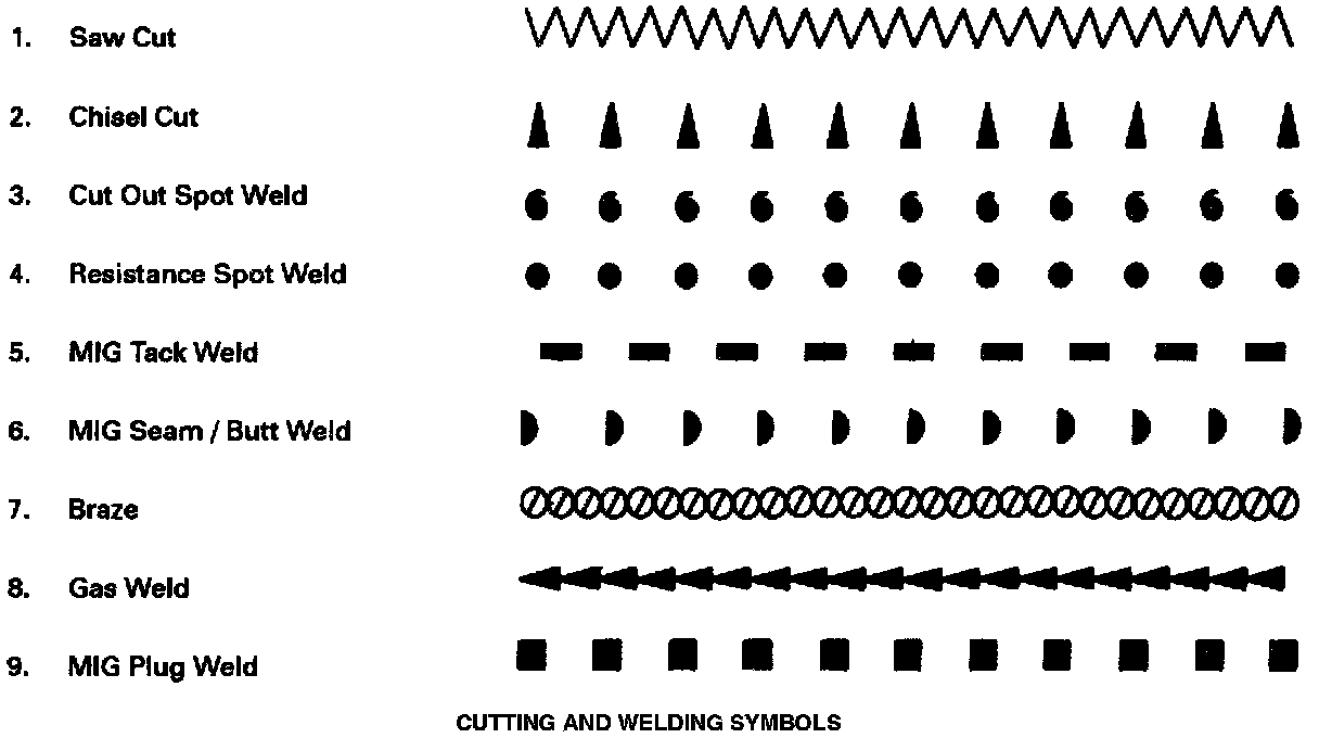 See Service Precautions for Safety other related information. In addition, consult Cutting and Welding Symbols chart (Below) before performing any operation that would require either of these duties. Service PrecautionsWhere 'resistance spot welding' is employed, the zinc coating should be lightly abraded away on the mating surfaces and those in contact with the electrode tips. Do not remove more of the zinc coating than is absolutely necessary.