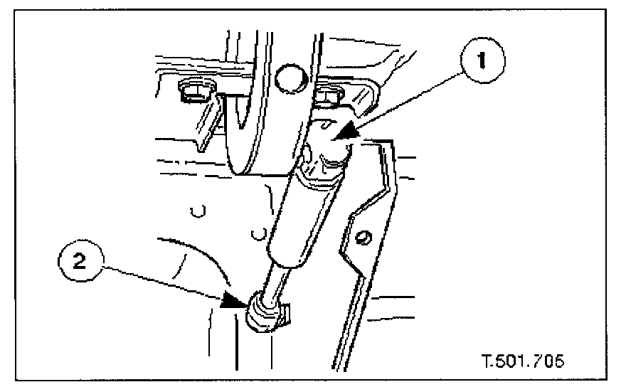 Using a long screwdriver, release clip at front end of strut, withdraw end from pivot and remove strut from vehicle.