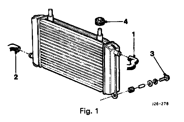 - Remove the bolts (3 Fig. 1) securing the radiator to the crossmember, release the radiator from the upper mounting grommets (4 Fig. 1) and remove the radiator from the vehicle.
