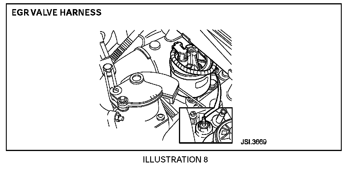 1. Open the hood and place covers over the fenders.2. Disconnect the EGR valve harness connector (Illustration 8).