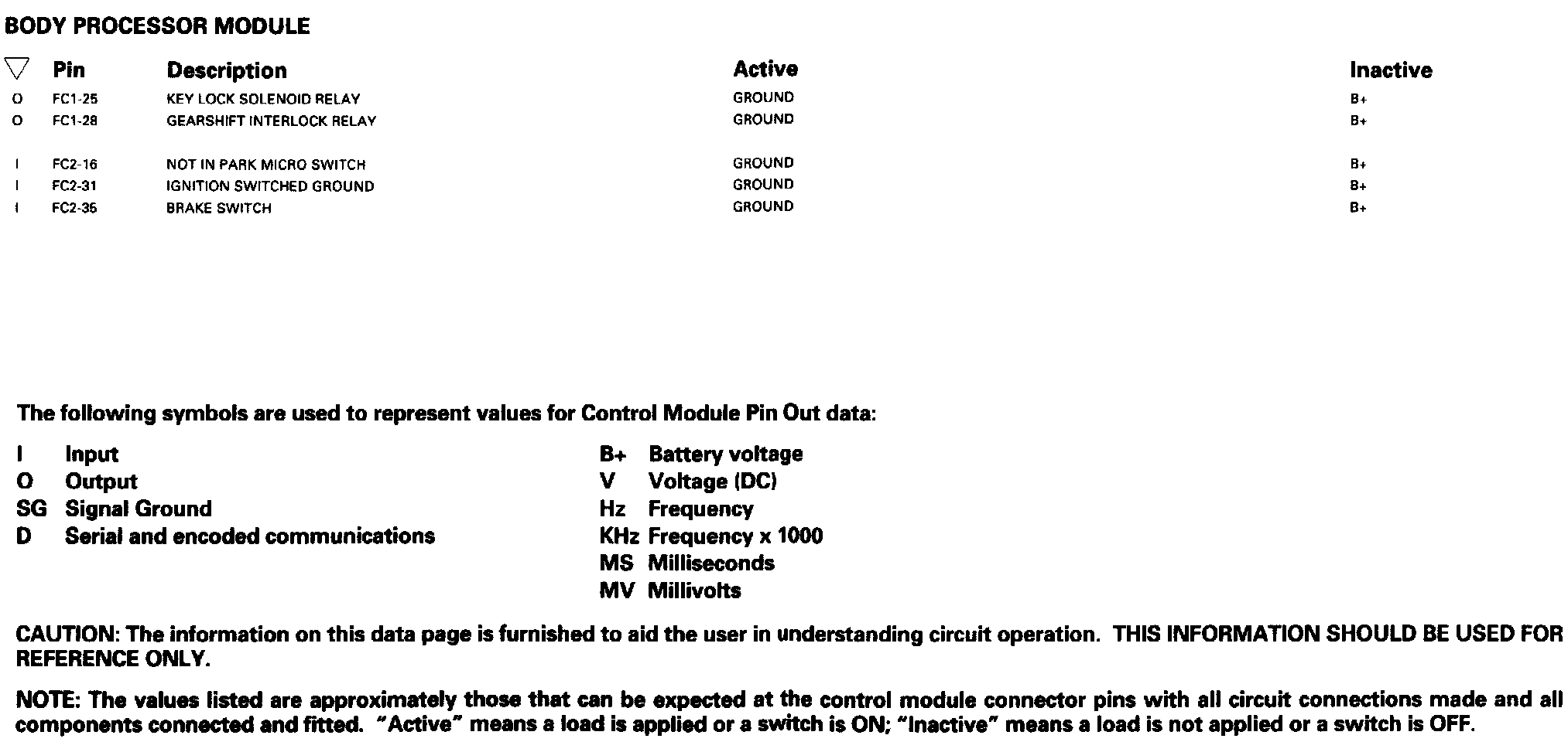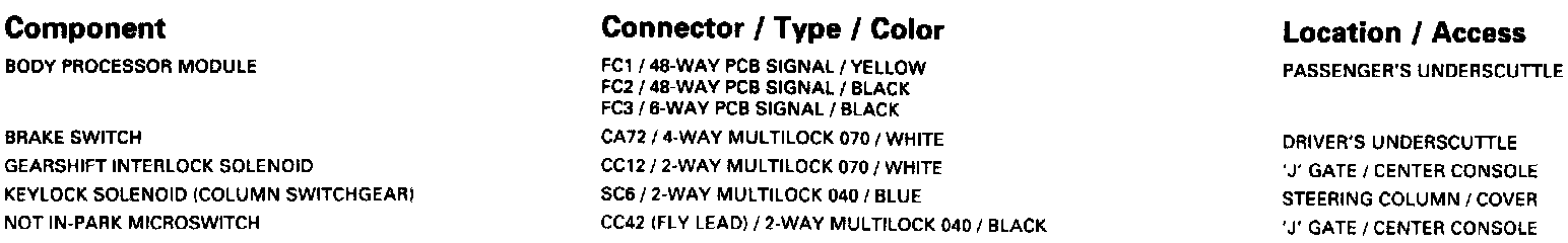 Gearshift Interlock: Control Module Pin Out Information:
