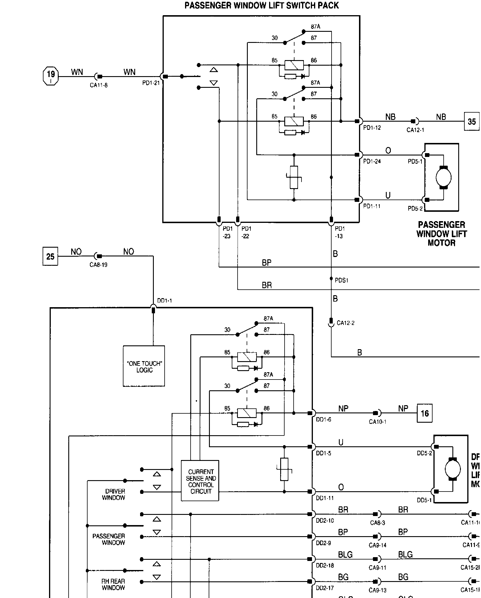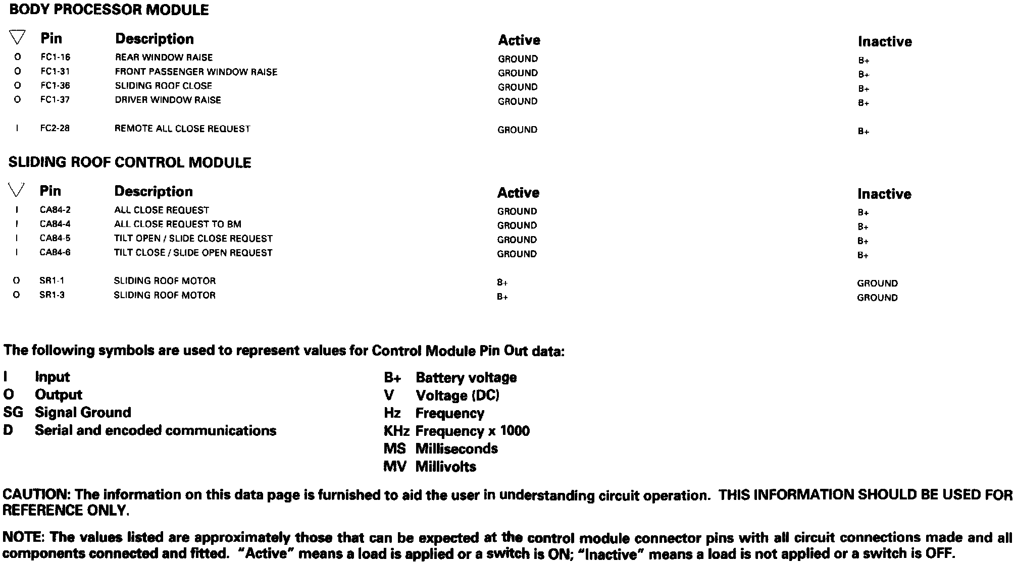 Window Lifts; Sliding Roof-LHD: Control Module Pin Out Information: