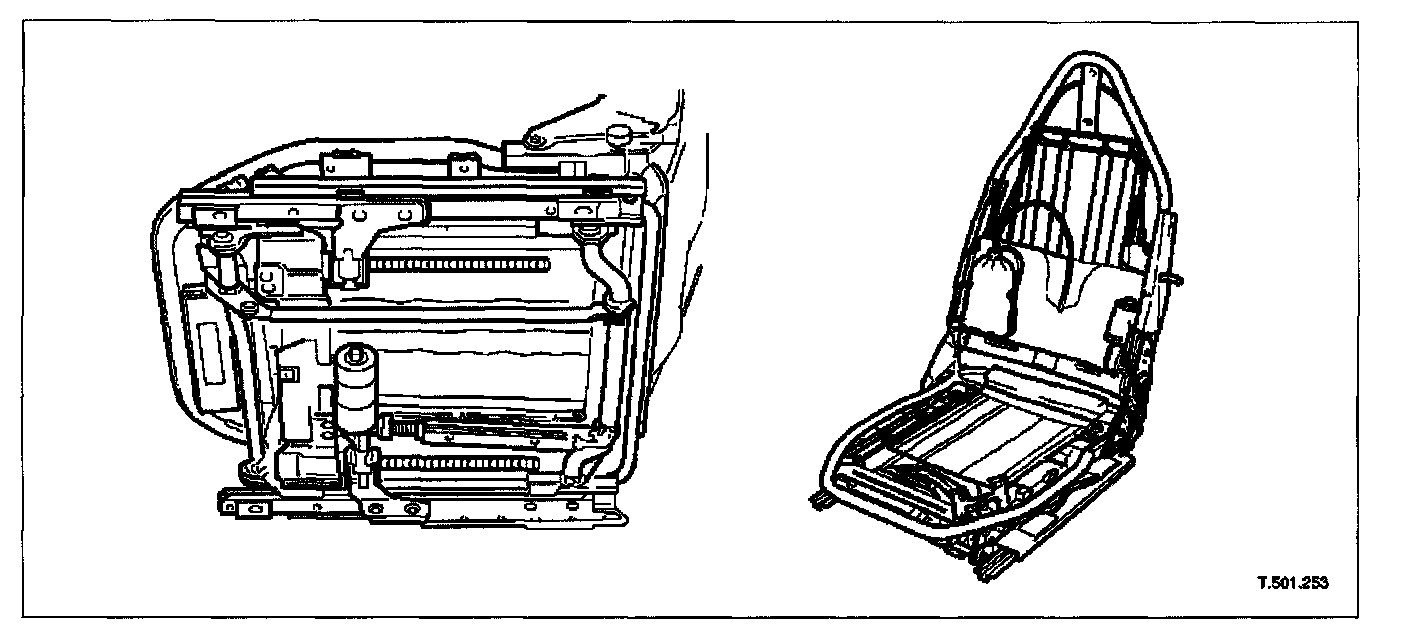 The front seat frames are common to the coupe and convertible. Standard seats have leather trimmed facings and cloth centers, with ambla cushions, squab borders and rear map pockets. Seat movement control switch assemblies installed in outboard side of driver and passenger seats, operate motors for fore and aft, recline and raise and lower adjustments via control modules installed below seat frames. Options and market variations include leather/ambla trim with lumbar support adjustment, seat heating, driver's seat position memory and passenger seat height adjustment. Only one of the slide recline or height adjustment motors can be driven under manual control at any one time. On vehicles fitted with driver's seat memory each motor is fitted with feedback potentiometers. When fitted, seat heating is controlled via illuminated on/off switches installed in the center console.