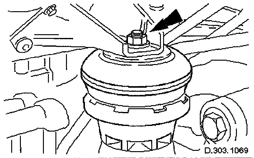 70. Remove the bolt which secures the engine rear mounting rubber to the transmission.