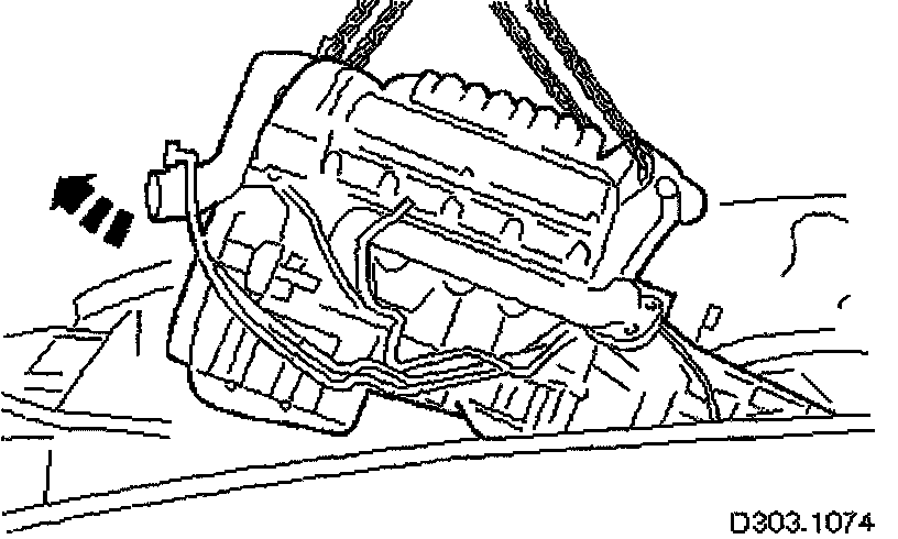 65. Install lifting chains to the hoist and connect to each engine lifting eye. Use longer chains to the rear lifting eyes to allow the engine to tilt rearwards when removing from the vehicle.