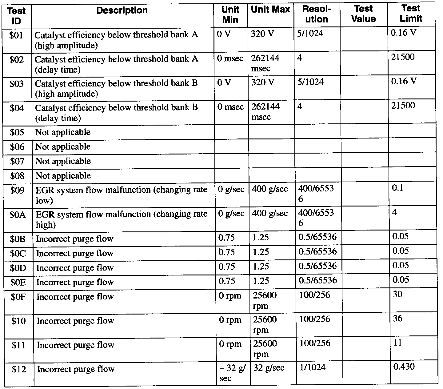 NOTE: Any appropriate value within the range (from the columns) Unit Min to Unit Max may be used in the column Test Value