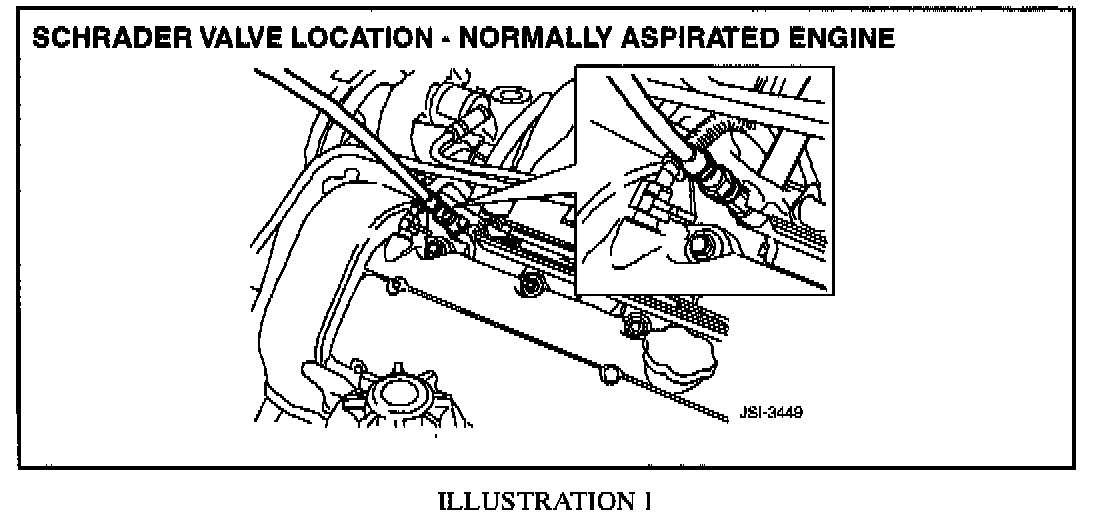 A Schrader valve for pressure testing is located on the front of the left (B bank) fuel rail, as shown in Illustrations 1 and 2. The location is the same on both supercharged and normally aspirated engines.