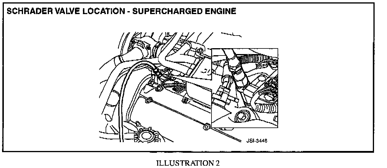 The access to the Schrader valve, on the supercharged engine, is partially blocked by harness connectors which must be moved aside, (Illustration 2).