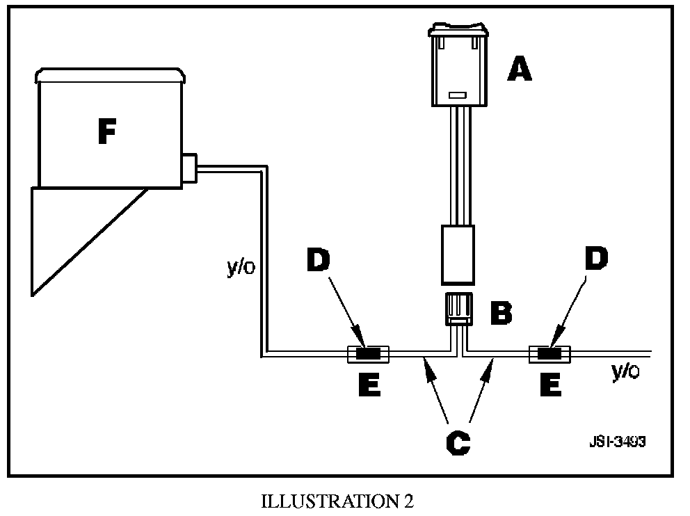 7. The switch, (A, Illustration 2), must be inserted in the yellow/orange wire which connects the main harness to the inclination sensor, (F, Illustration 2).