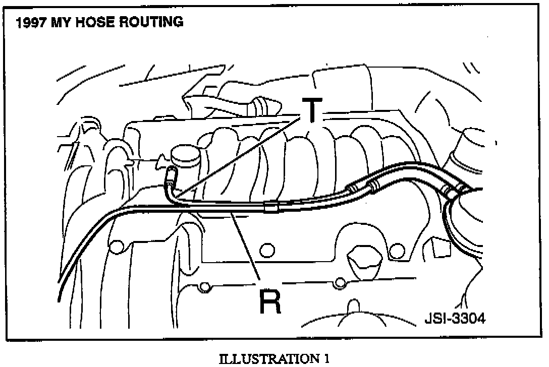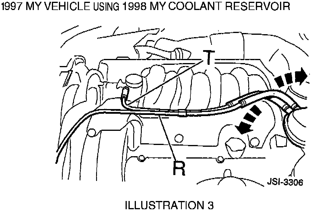 There are differences between the routing of the cooling system bleed lines between 1997 Model Year vehicles and 1998 Model Year vehicles. Incorrect routing at the coolant reservoir connections could lead to air remaining trapped in the cooling system, resulting in overheating of the engine.