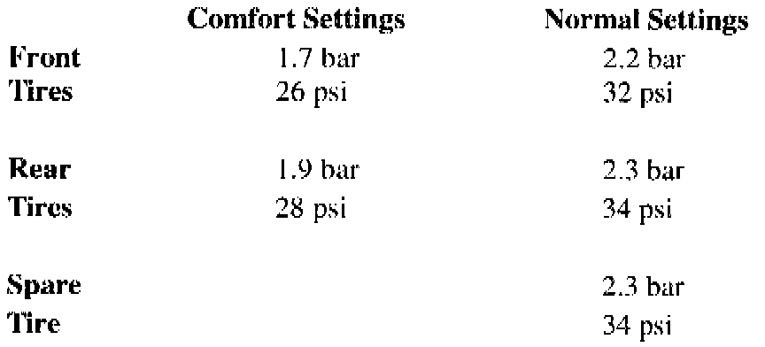 3. Partly raise the vehicle. Check the tire pressures, to determine whether the owner is using "Comfort" or "Normal" pressure settings. (See step 7 below).