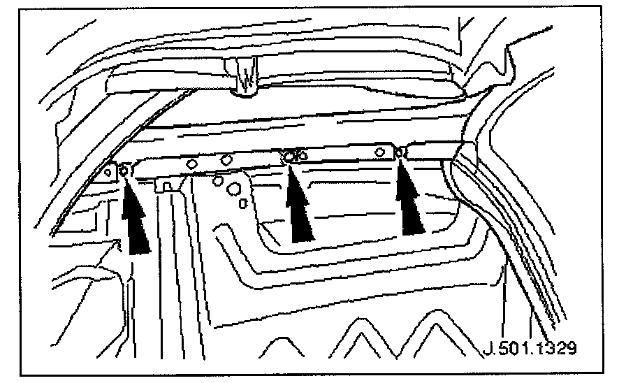 9. Slacken and remove headlining rear header rail clip securing nuts, remove clips and release tension cables.