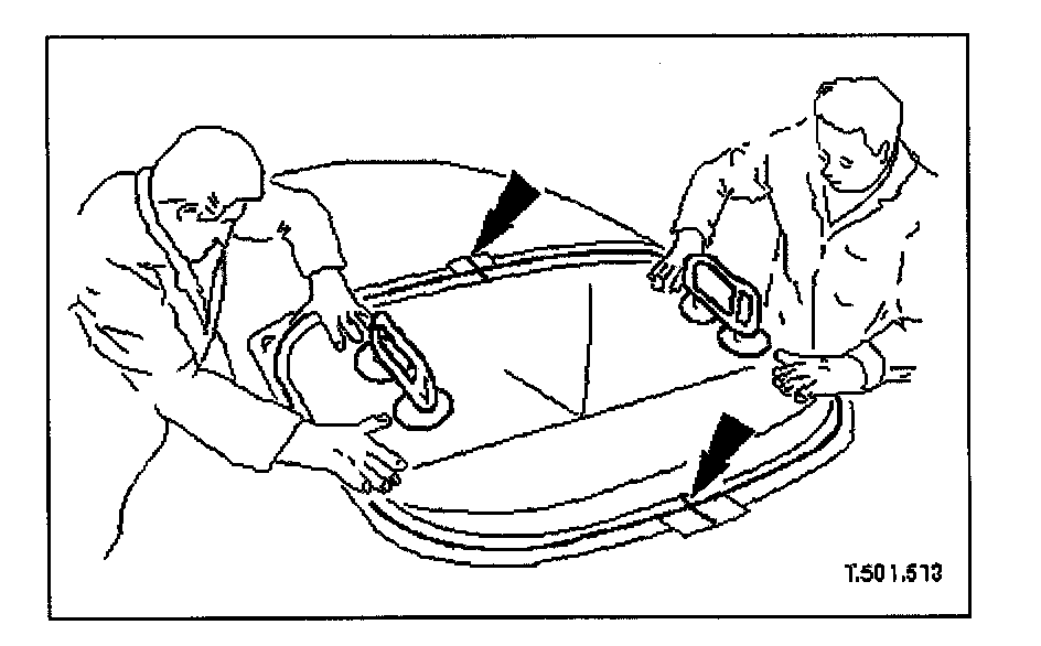 16. Fit lifting handles to glass and with assistance, carefully remove rear window from vehicle and place on clean cloth on bench.