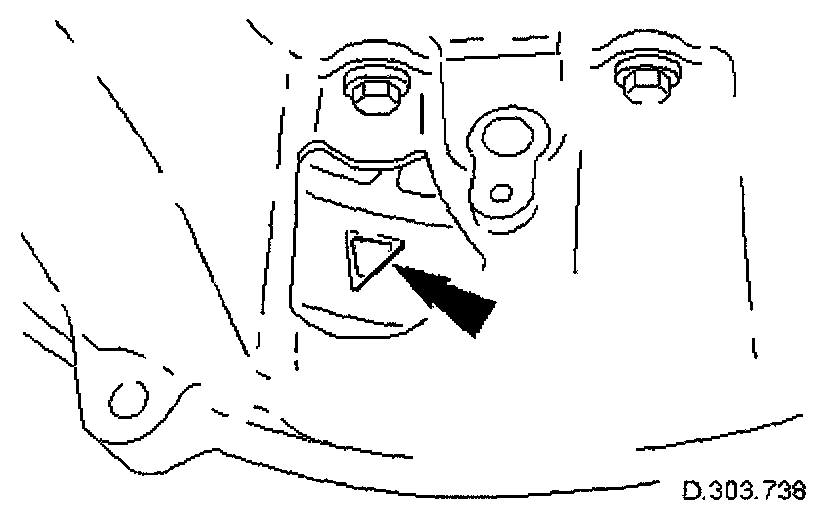 8. Rotate the crankshaft until the triangular arrow indent on the drive plate is visible through the access hole; confirm that the timing flat on each camshaft is uppermost.