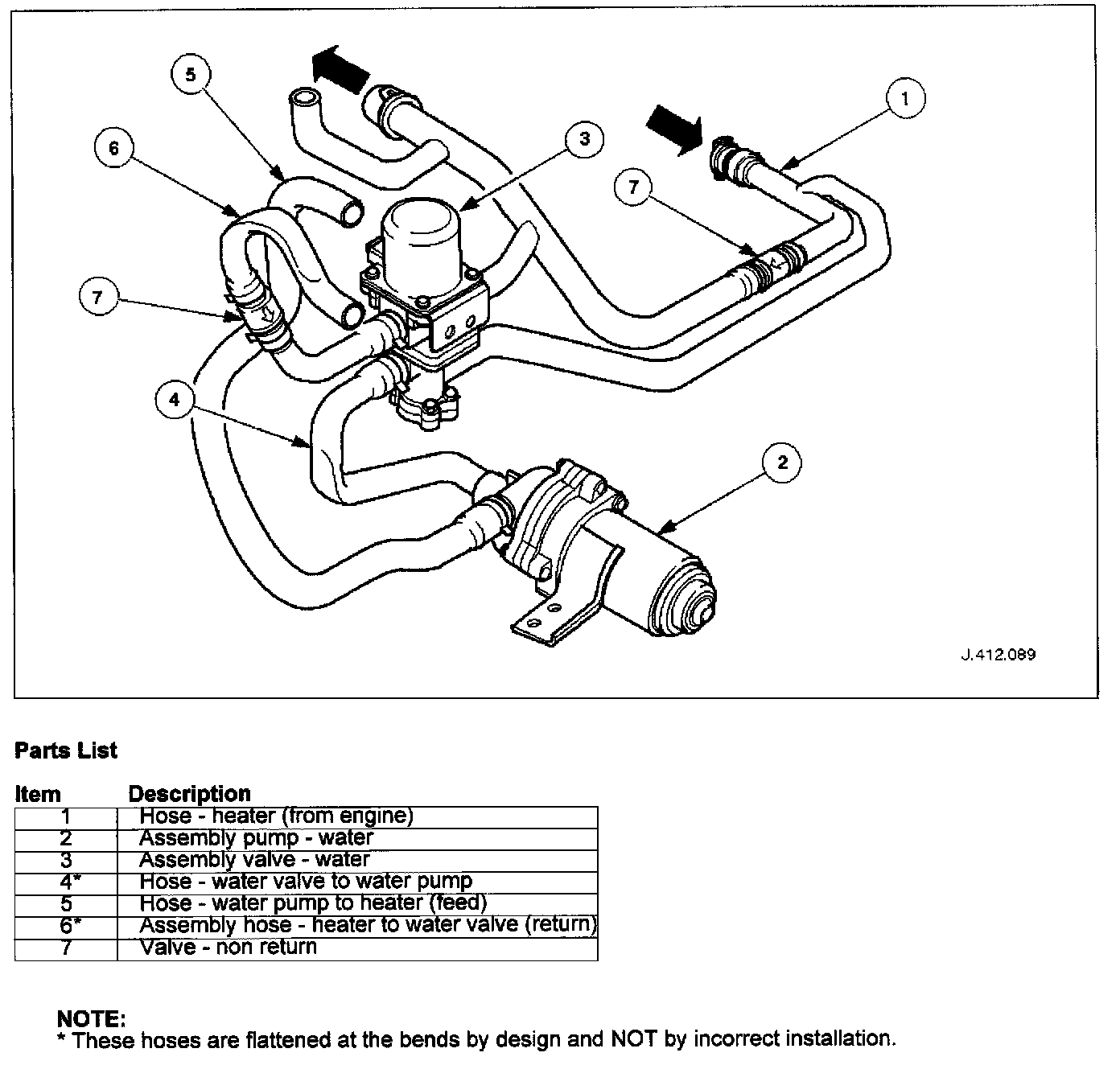 Non return valves are located in the heater bypass hose and the hose between heater outlet and water valve. These valves are required to prevent coolant flowing in the wrong direction at low engine speeds and restrict connected flow through the heater after the engine is switched off.