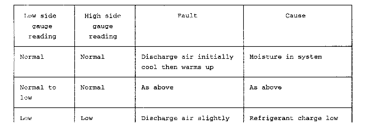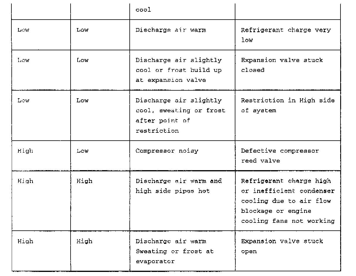 This table should be used in conjunction with the graphical representations of 'High side' pressure/ambient temperature and 'Low side' pressure/evaporator temperature.