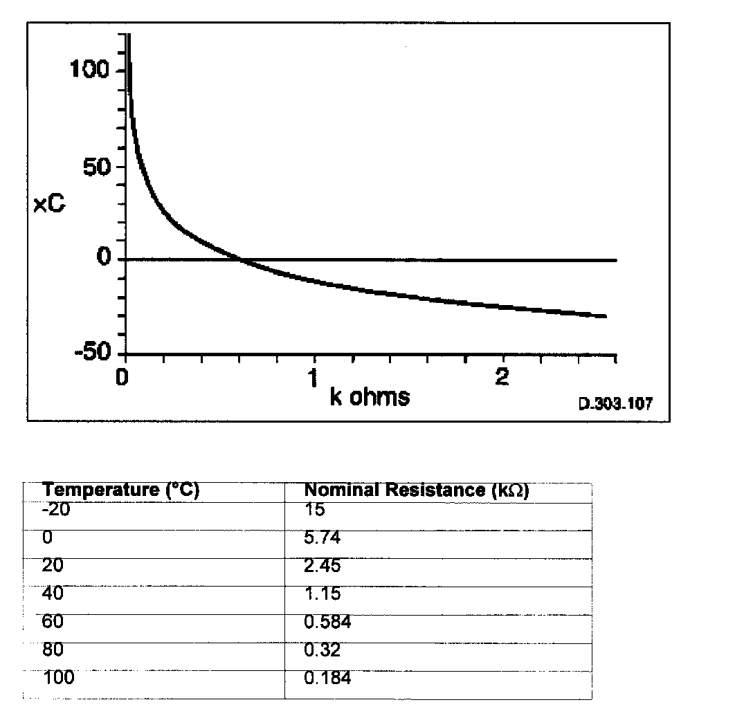 The sensor outputs a voltage to the ECM which decreases as temperature increases.