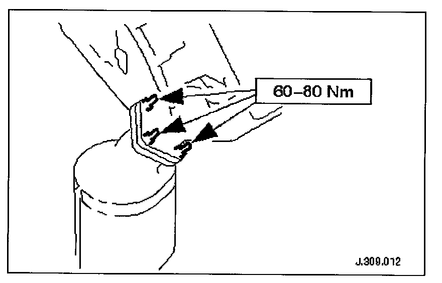 Fit, but do not fully tighten, the mounting bracket securing bolts. (Leave loose until the nuts securing the downpipe to the exhaust manifold are fitted.)